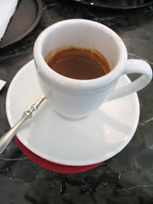 依照去義式咖啡館的慣例,我點了杯 espresso,eris 點摩卡奇諾(不過我竟然忘了照,阿阿阿~)。Mango 的 espresso 杯子我沒見過,比起以往的高了些(照片看不出來),剛上來的時候 crema 真是多到一整個誇張阿!超級濃厚的 crema 配上誘人的香氣。而 espresso 是偏酸的口味,看起來非常非常濃厚,但是喝起來卻比外表溫和(當然還是很濃),而且後段很完美,沒有一絲絲的苦尾(這我覺得蠻厲害的,拉霸機看起來就是很難控制),非常完美的 espresso!