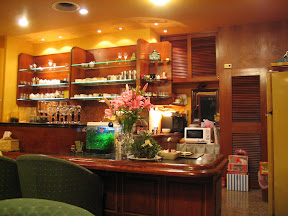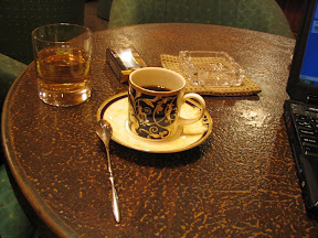 窗明几淨的咖啡館,外頭是整片斜斜的落地窗,店裡的看起來都不是客人(包場耶,爽快!)。進來之後,接著服務生(應該是老闆娘吧?)親切的招呼。桌上擺了塊絨布,上面是煙灰缸,感謝上帝,這裡是可吸煙的咖啡館。全部的座位都是類似沙發的座椅,牆上擺了個很像時鐘的東西,不過我並不確定它是否會運轉。服務生給我一杯茶水,但我也喝不出這是什麼茶。總之第一印象很不錯。屬於比較明亮的咖啡館。