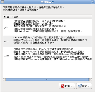 這東西是我在用 python 寫些小工具處理 lazybuntu 中選擇輸入法用到的。因為要選擇輸入法時,需要跳對話視窗讓使用者選擇愛好的輸入法,不過我又不太會用 pygtk,後來想到了好久好久以前好像有在某一版的 gnome release note 看過這種可以簡易產生對話框的小工具,後來找一下就發現了 zenity。