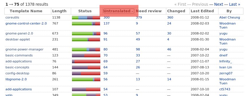 如果不知道該翻譯哪些軟體,可以試試看翻譯率較低的軟體。按下 Untranslated 兩次來將翻譯率低的排到前面來。