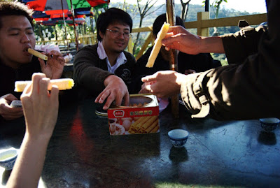 到了貓空就邊泡茶,邊把香港的戰利品:德成號蛋捲一磅給嗑啦!果然蛋捲這種東西做的在怎麼好吃,也沒辦法從嘴巴裡發光、背上冒出一條龍。我吃起來跟福益軒差不了多少。但是在香港的時候所有蛋捲都訂購一空,如果要買只能過年後才能買。最後跟他們說我們是台灣來的,他才賣給我們一磅。結果也沒好吃到冒出龍來。