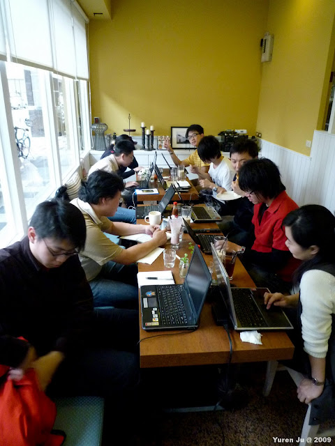 社團聚會完後,我、Rex 跟 Hychen 又殺到巨蛋站的卡布里咖啡館參加 COSCUP 聚會 + 銷售組會議。這次第一次看到 Kevin 跟蝦蝦!還有很多熟面孔像是 Lloyd, IJS 還有一大群 KaLUG 的朋友 XD