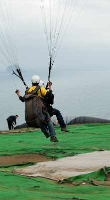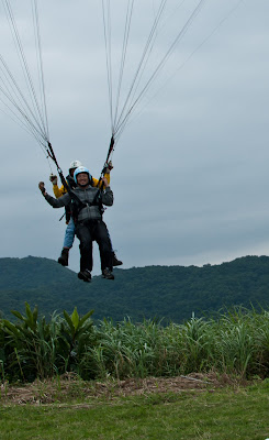等到 Chialin 他們上來後,就準備換我們飛囉!基本上就是等教練整理完飛行傘的線,扣上連接器後,等到教練喊跑,我們就飛上去囉!
