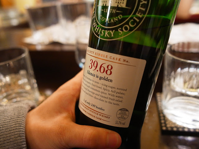 不過我對威士忌實在沒有研究,只知道 39.68 前面的數字代表的是酒廠,後面的是第幾桶酒。為什麼用數字代表呢?基本上是蘇格蘭威士忌為了想讓會員們能夠更持平而論的喝酒,所以他們出產的酒並不用產區或者酒廠標示,而改用數字的方式表達。這樣大家才不會對產區或國家有先入為主的概念。然後這瓶 39.68 好像是小自由最後的一瓶 39.68 了。剛開始在酒吧裡面的時候,老闆也推薦了這瓶酒給另外一對客人。