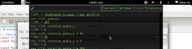 在 GNOME3 extension 開發的時候有個非常好用的工具叫做 Looking glass,這個東西就像是雷神之錘按下 "~" 就可以叫出來的 console (然後可以在裡面輸入作弊指令)。在 GNOME3 的環境下,按 alt + F2 並且輸入 lg 你就會看到這個 console 緩緩地從上面降下來。
