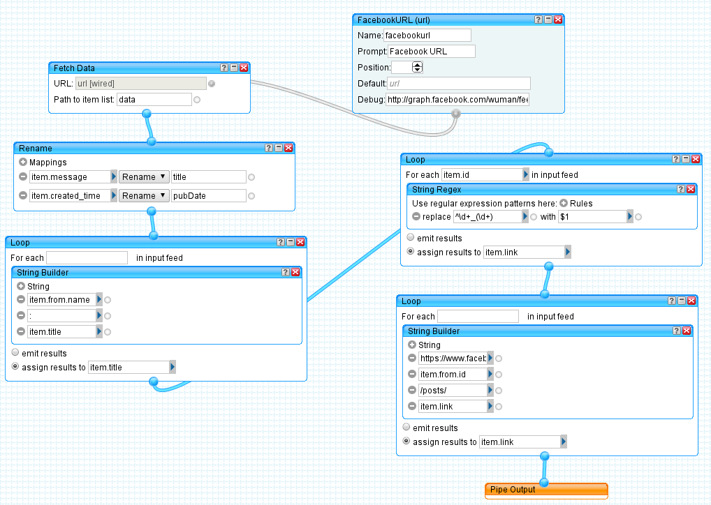 Loop - String Regex 的部分則是用來把 item.id 裡面類似 724235041_10150262195320042 的結構取出後者(也就是 post-id)並且儲存