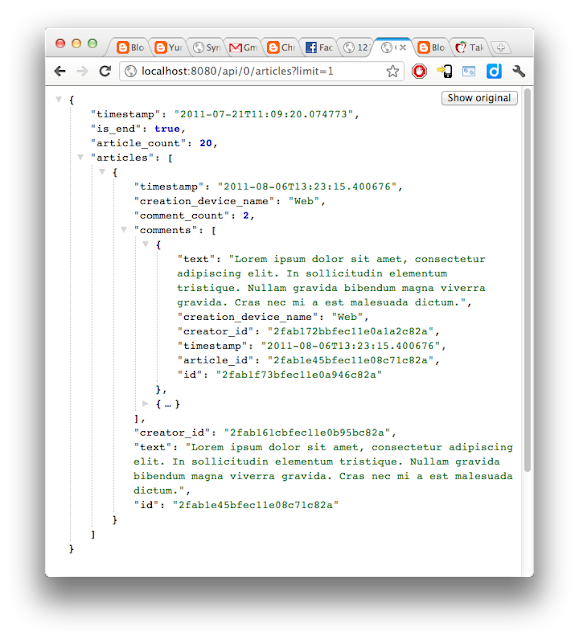 當用瀏覽器開啟 http://localhost:8080/api/0/articles?limit=1 的時候,就可以獲得以下結果: