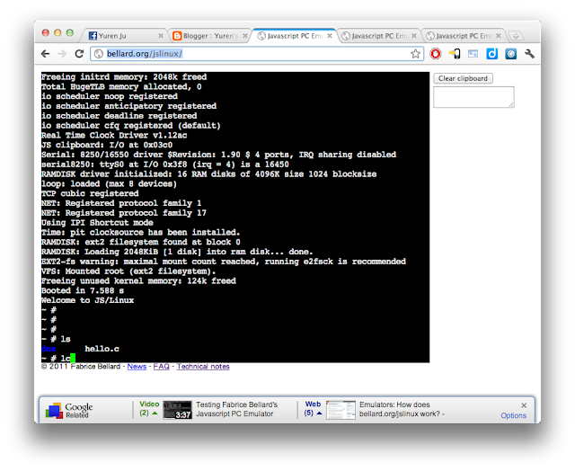 前陣子有個很有趣的 project - jslinux,這個專案主要是在瀏覽器上面模擬 x86 電腦,再將 Linux 跑在瀏覽器上面。等於說這個專案簡單實作了 PC 模擬器,就如同 VMWare, VirtualBox 一樣,但是在瀏覽器上就可以跑模擬器上面的 OS 了。甚至在上面還包含了一個 C compiler,可以在上面編譯程式。