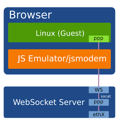 這個延伸的專案是 jsmodem,主要的功能是在 jslinux 這個 javascript emulator 上加上一個 modem,讓瀏覽器裡面的 Linux 可以上網,我看了一下 source code,推敲的架構如下: