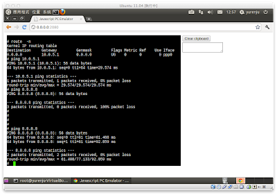 這個 linux 會利用 pppd 的方式開啟一個網路介面,並且接到 jsmodem。而 jsmodem 利用 websocket 的方式向 server 通訊。所以要讓 jslinux 可以上網,必須要在本機端跑一個 websocket server,並且用 iptable forward 封包。