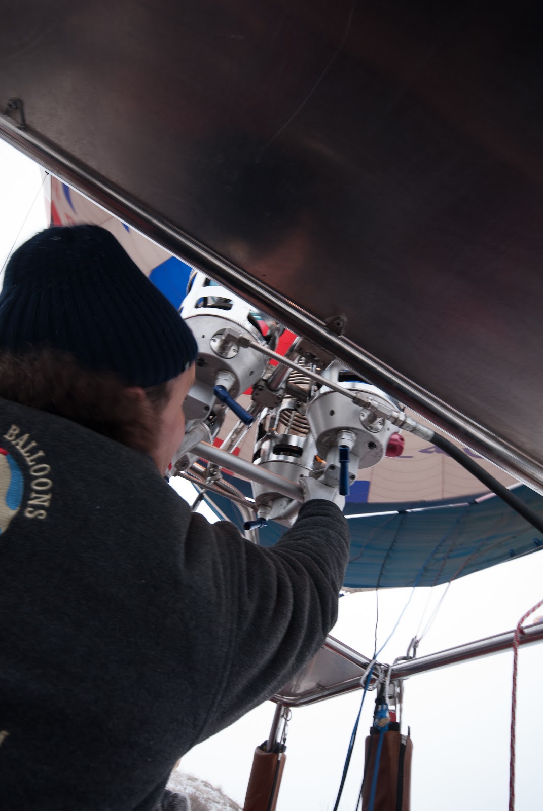再度搭上接駁車緩緩的往起飛地前進後,踏著熱汽球旁邊的踏板,我們搭上了熱汽球。這是我們的飛行員