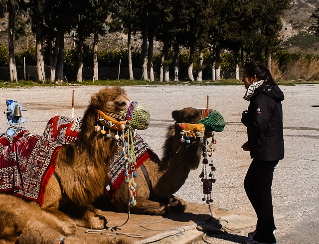 出來的時候外面還有人牽著駱駝讓人拍照 (當然是要付費的),我們團有幾個人都去拍照了,下面這張是 Emily 去跟駱駝合拍的情況