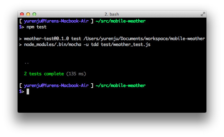 4 - 8 行的部分是指定 devDependencies 要使用 mocha, chai 跟 jsdom。9 - 11 行做的是執行 npm test 的時候事實上會執行 node_modules/.bin/mocha -u tdd test/weather_test.js。這之後如果換了 unit test framework 也可以很輕易地從這邊換掉測試方式 :-)