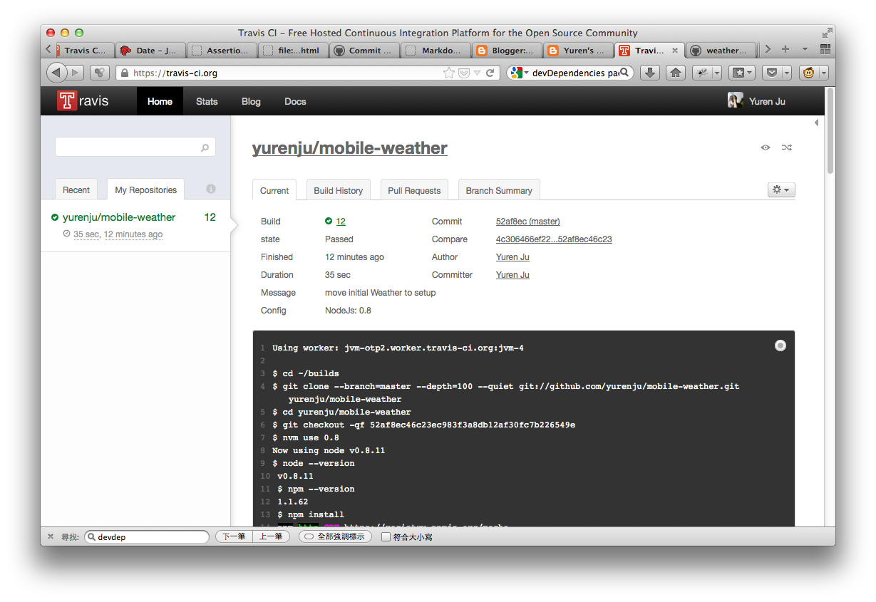 這邊我們指定採用 node.js,並且只測 0.8 這個版本。其實我們只有在 unit test 的時候會用到 node.js,基本上他還是一個一般的 browser app。所以不需要測試多個 node.js 版本。把這邊全部都 push 上 github 後,用你的 github 帳號登入 travis。然後在 account 的頁面找到你的 project 把右邊的 switch 推到 on。